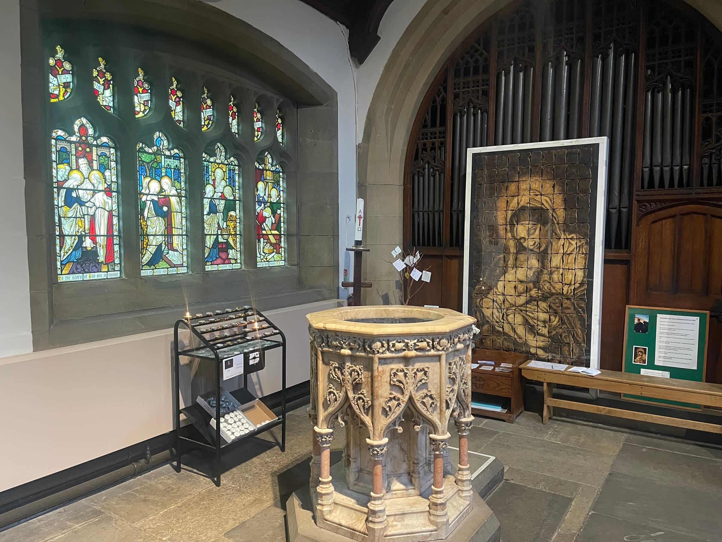 The font used for baptism ceremonies is made from alabaster and has marble columns. It was gifted to the church by Mrs. George Merrall and was returned in 1929 after disappearing for several years.